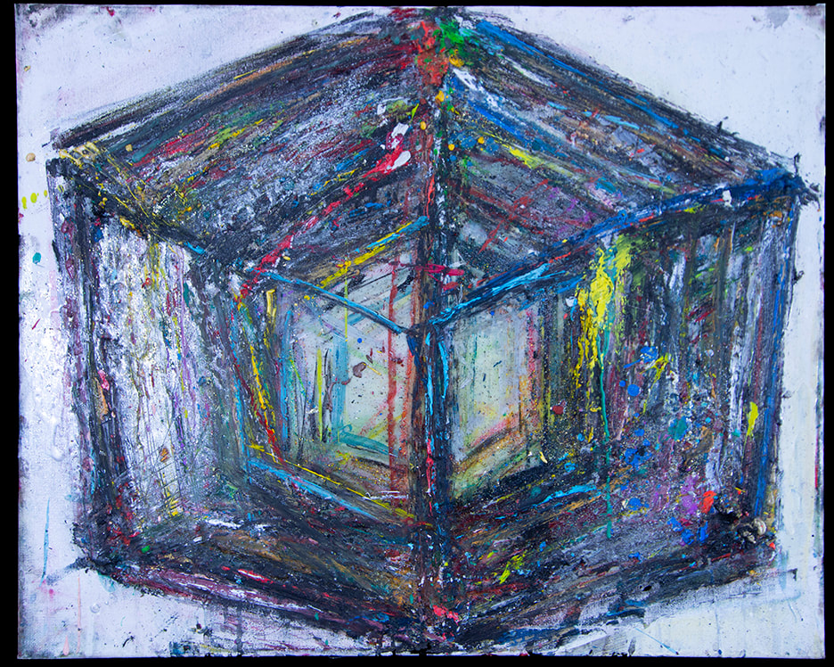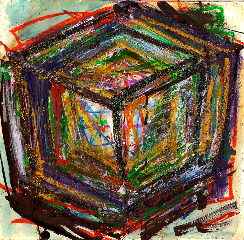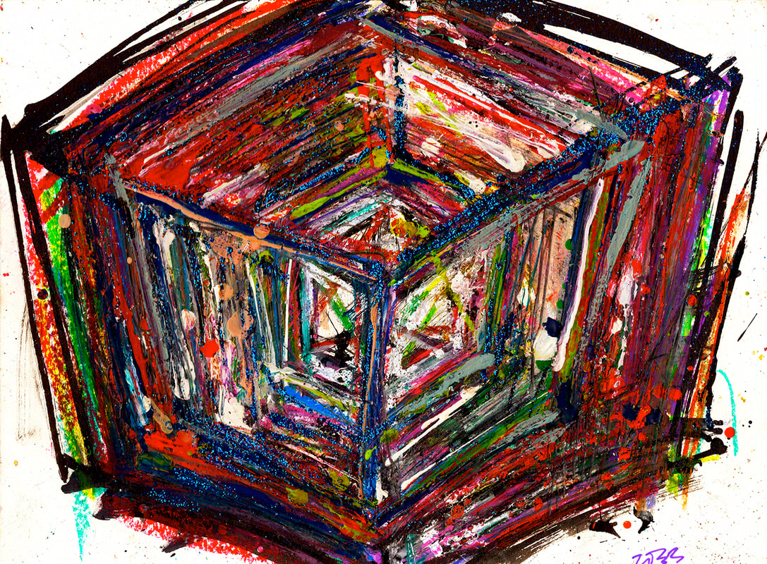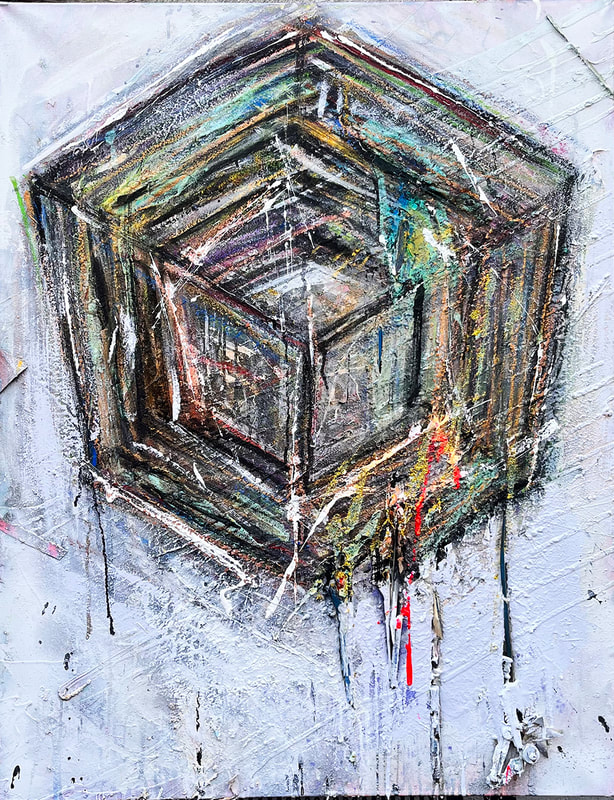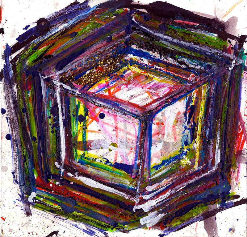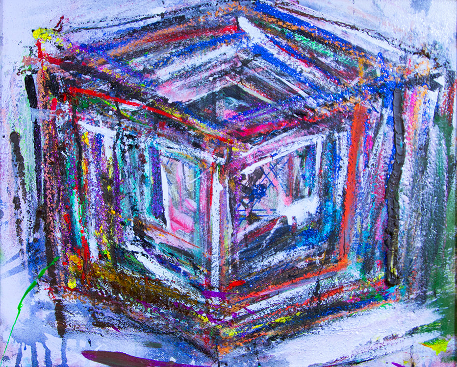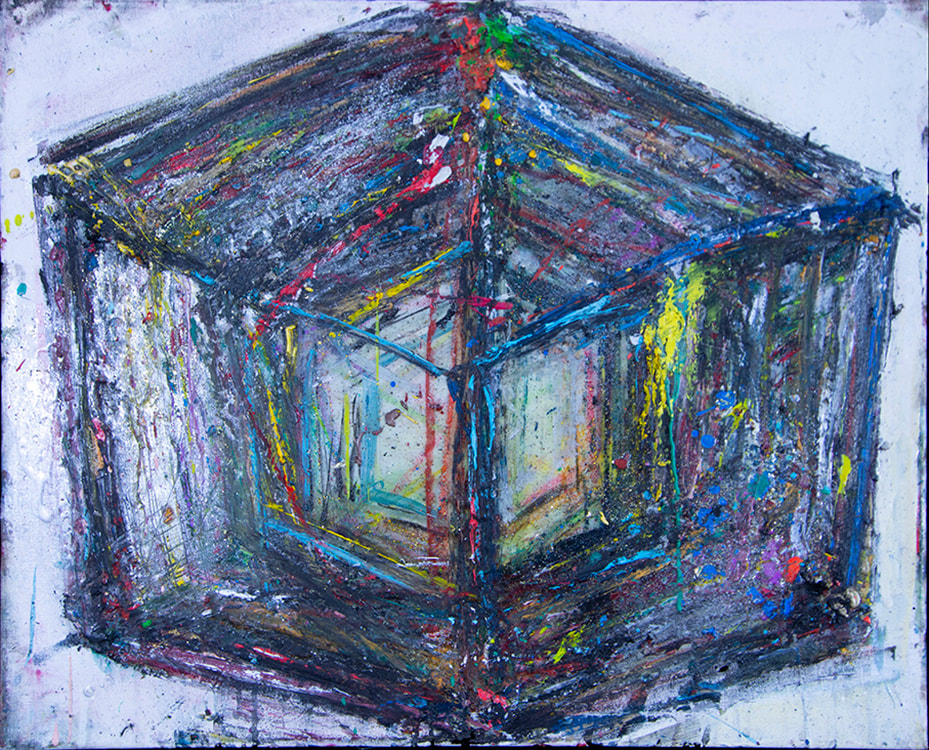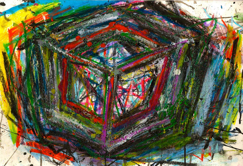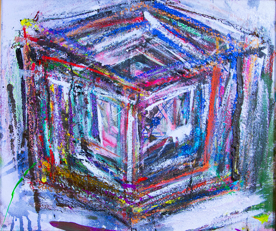 My art is a mystical practice in sacred geometry, wielding color and line to conjure the sensation of dynamic Platonic forms, made with oil, acrylic, oil stick, ink, crayon and liquid paper on canvas, and museum board over the past year. The optical illusions created in these pieces are born from a flat, two-dimensional surface, and can only exist within the viewer's mind. I employ Expressionism to breathe life into these four-dimensional creations, weaving whimsical arabesques that dance between figuration and abstraction.