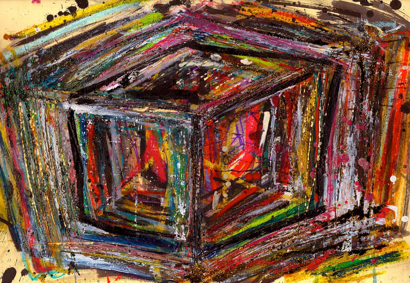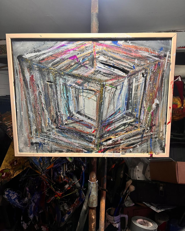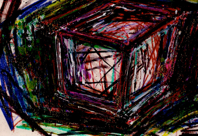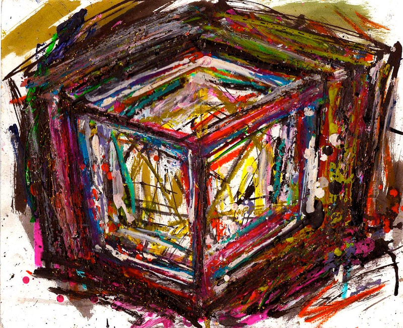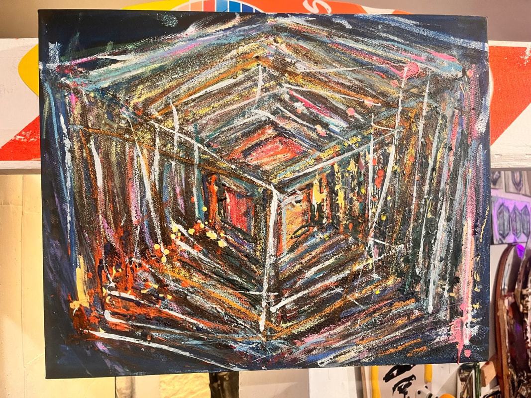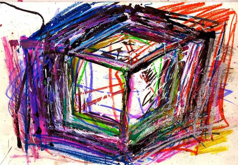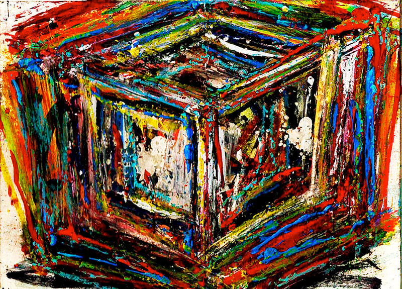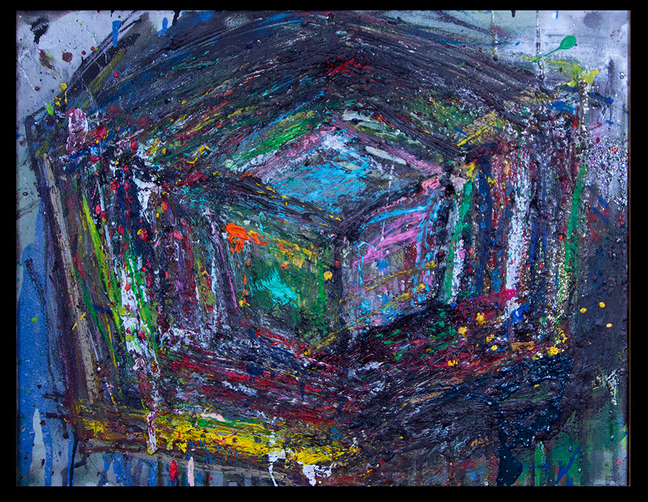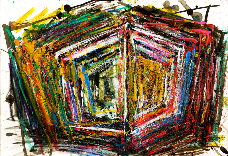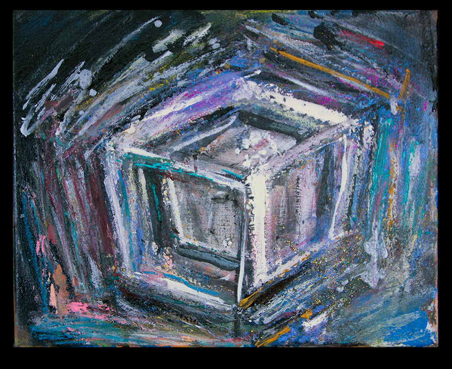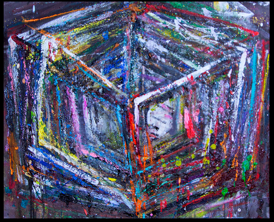 My art is a mystical practice in sacred geometry, wielding color and line to conjure the sensation of dynamic Platonic forms, made with oil, acrylic, oil stick, ink, crayon and liquid paper on canvas, and museum board over the past year. The optical illusions created in these pieces are born from a flat, two-dimensional surface, and can only exist within the viewer's mind. I employ Expressionism to breathe life into these four-dimensional creations, weaving whimsical arabesques that dance between figuration and abstraction.