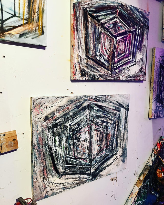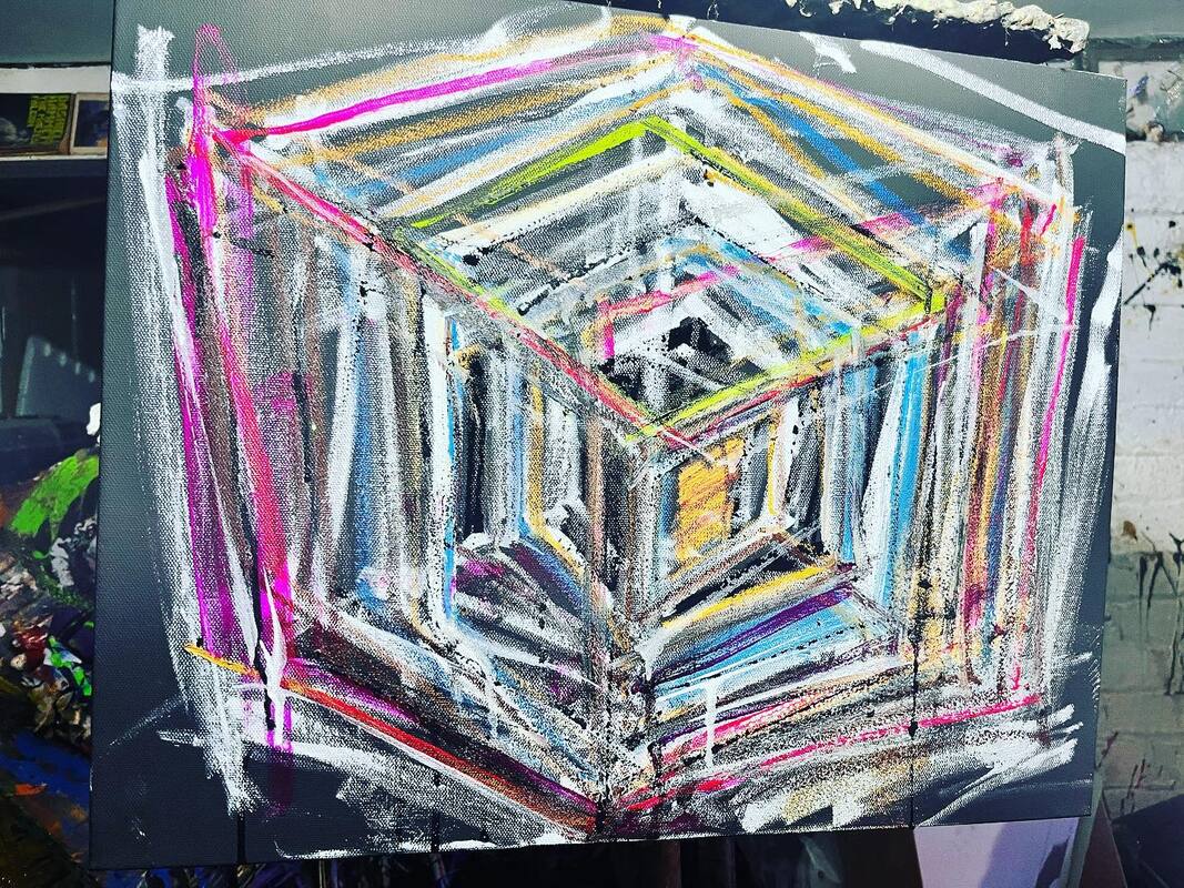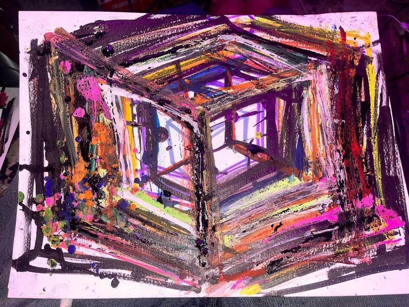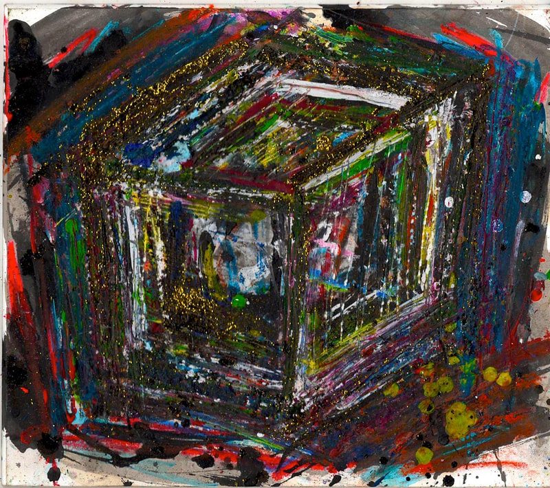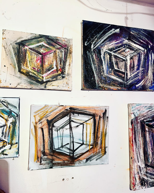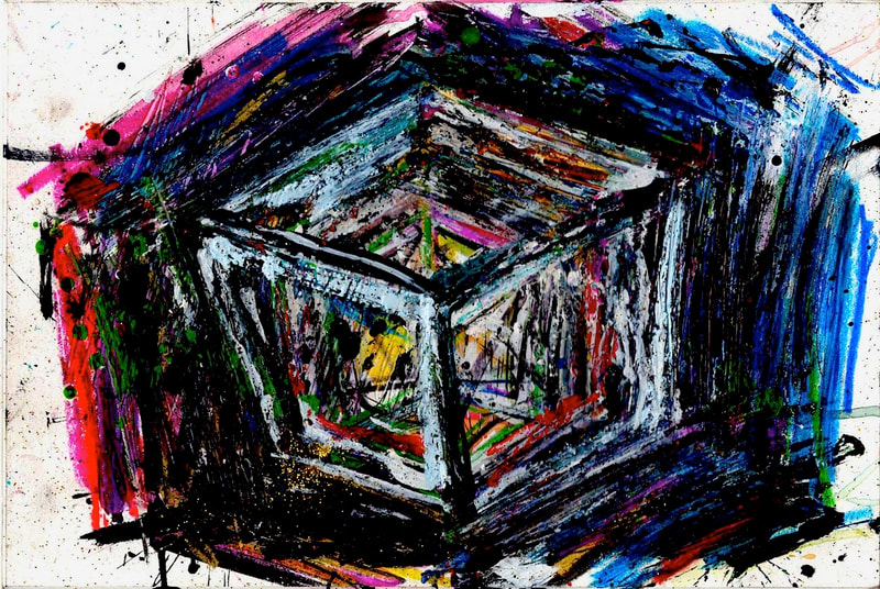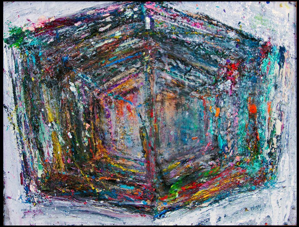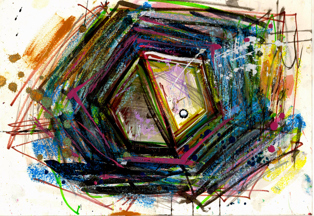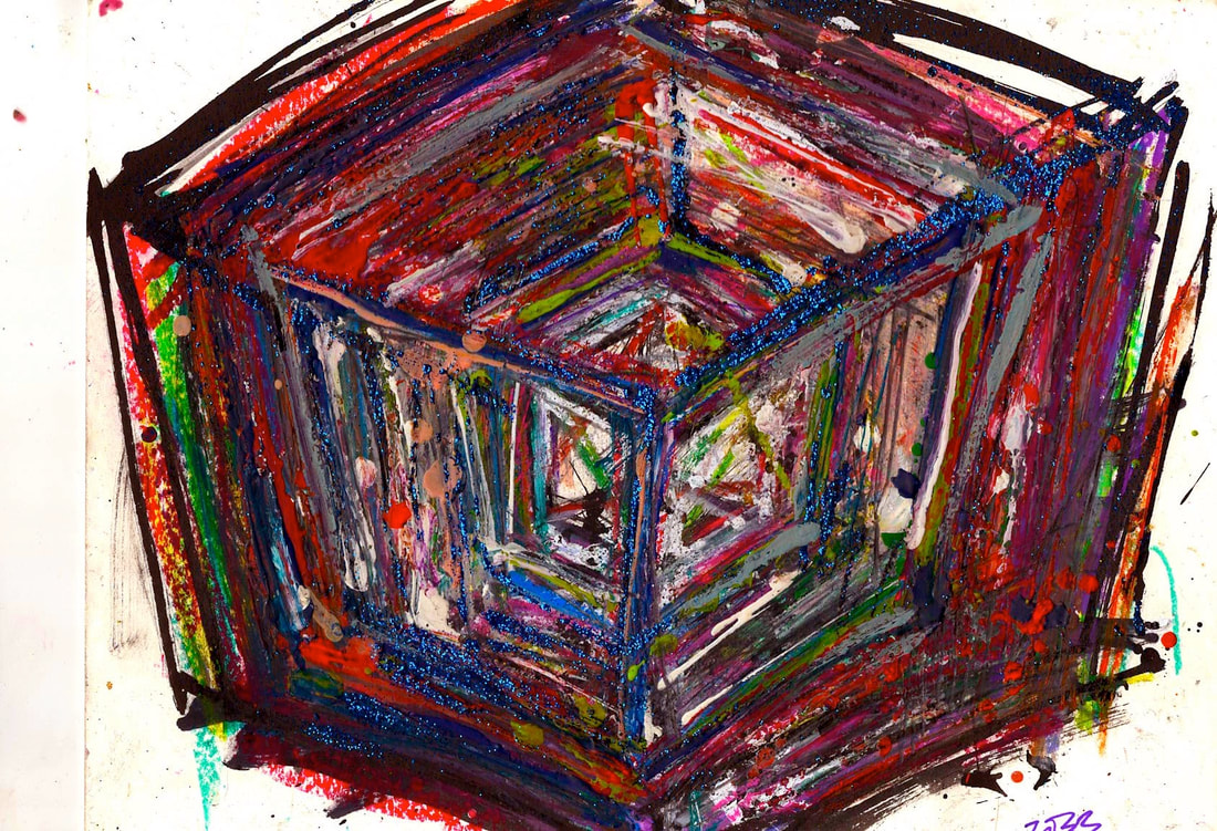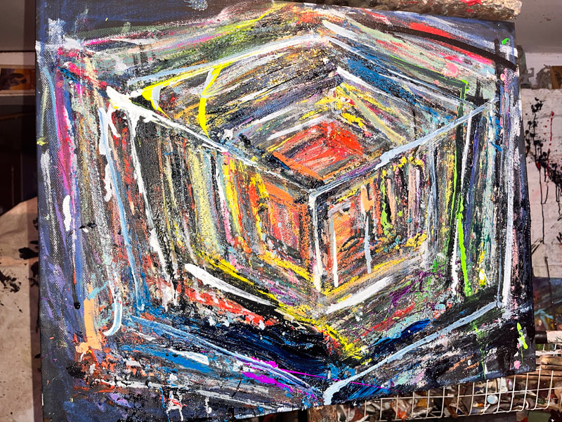 My art is a mystical practice in sacred geometry, wielding color and line to conjure the sensation of dynamic Platonic forms, made with oil, acrylic, oil stick, ink, crayon and liquid paper on canvas, and museum board over the past year. The optical illusions created in these pieces are born from a flat, two-dimensional surface, and can only exist within the viewer's mind. I employ Expressionism to breathe life into these four-dimensional creations, weaving whimsical arabesques that dance between figuration and abstraction.