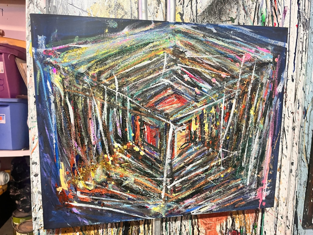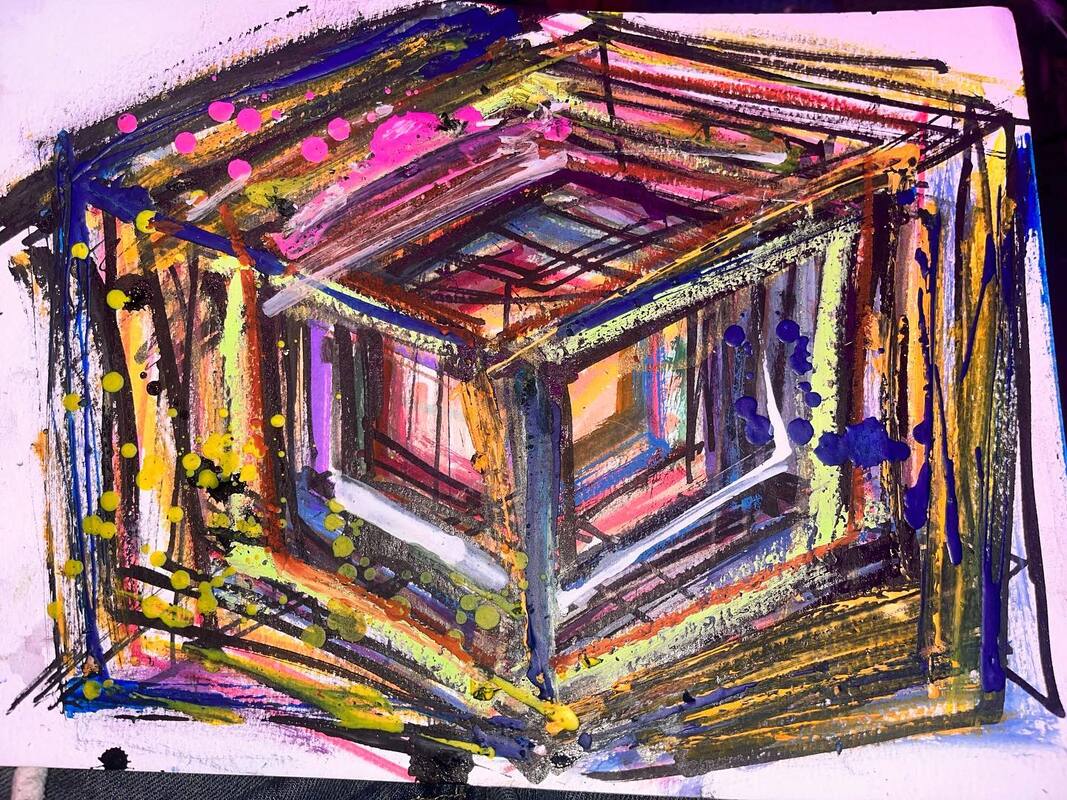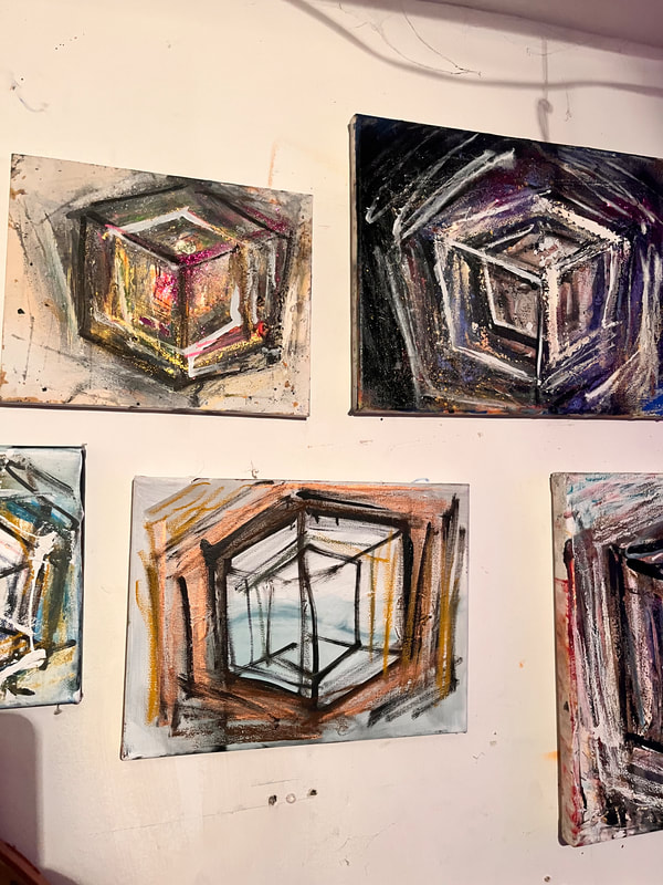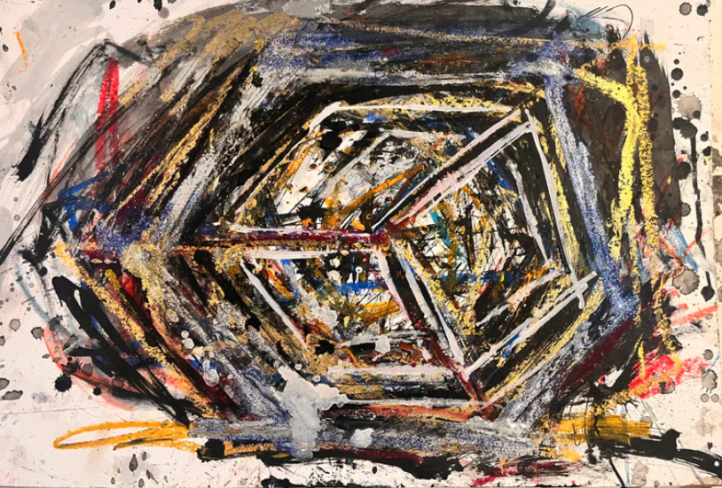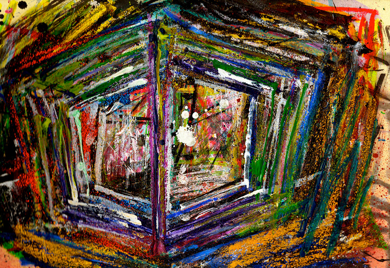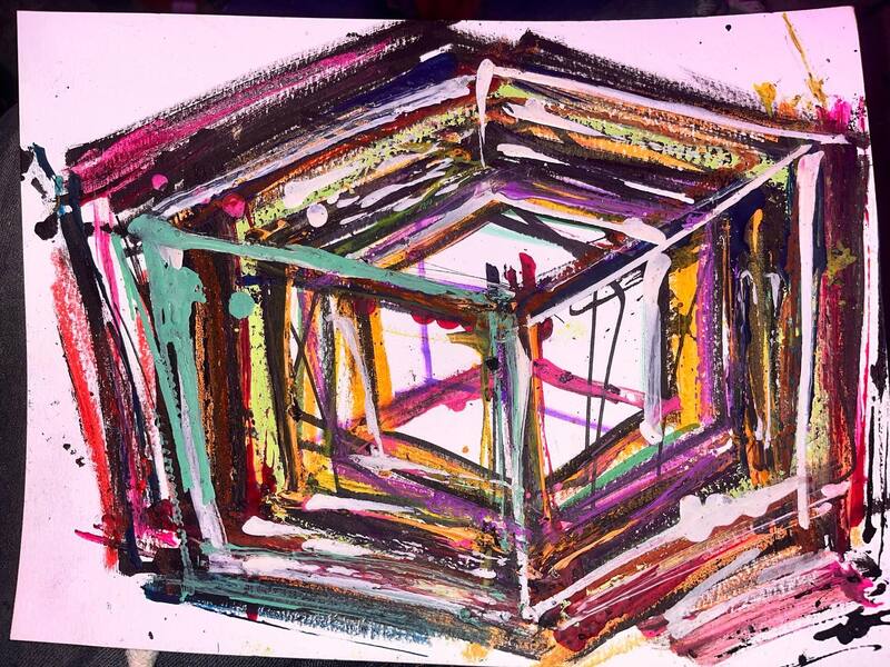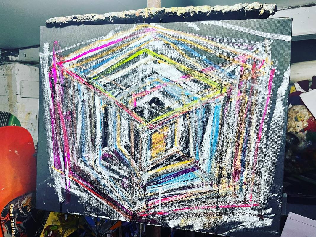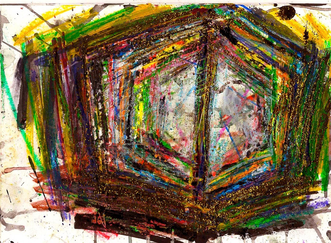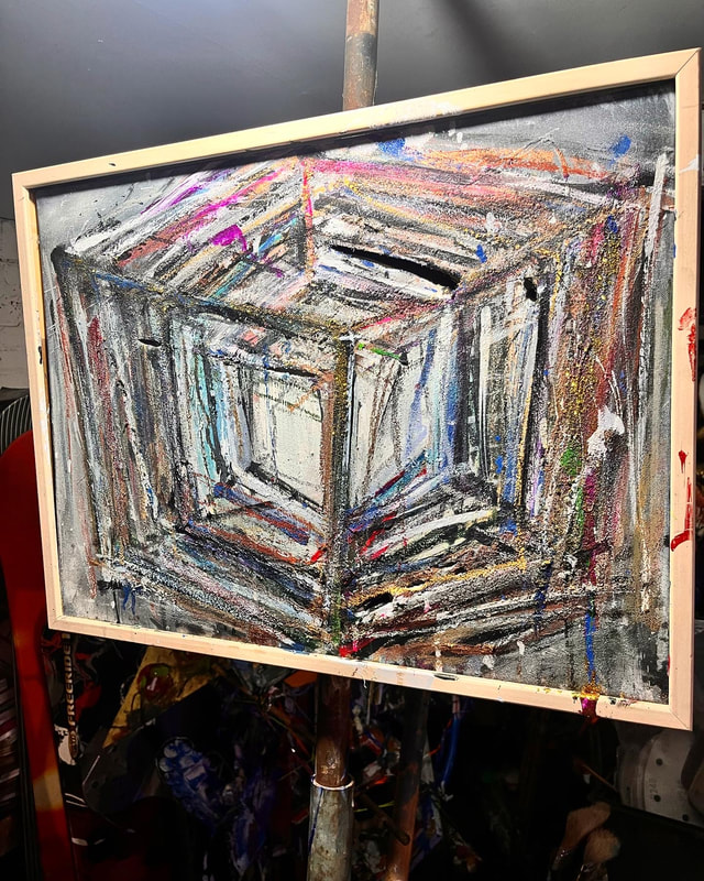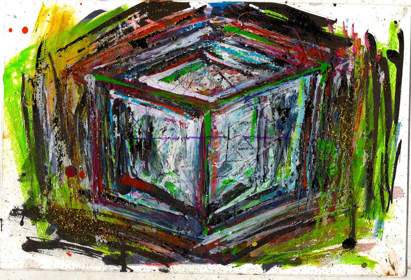My art is a mystical practice in sacred geometry, wielding color and line to conjure the sensation of dynamic Platonic forms, made with oil, acrylic, oil stick, ink, crayon and liquid paper on canvas, and museum board over the past year. The optical illusions created in these pieces are born from a flat, two-dimensional surface, and can only exist within the viewer's mind. I employ Expressionism to breathe life into these four-dimensional creations, weaving whimsical arabesques that dance between figuration and abstraction.