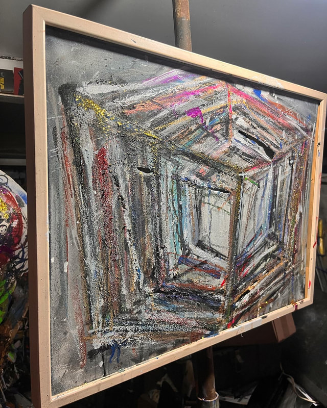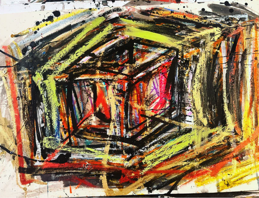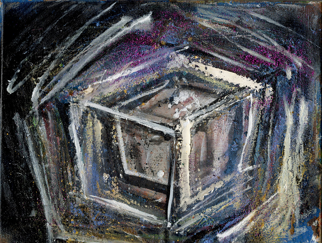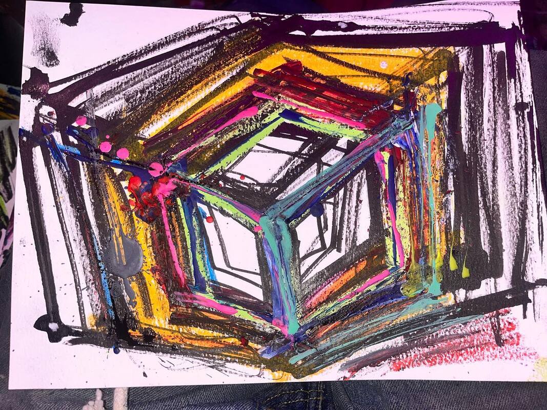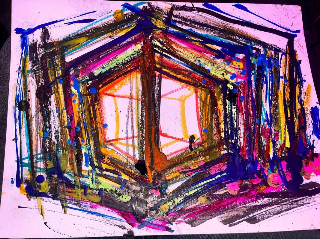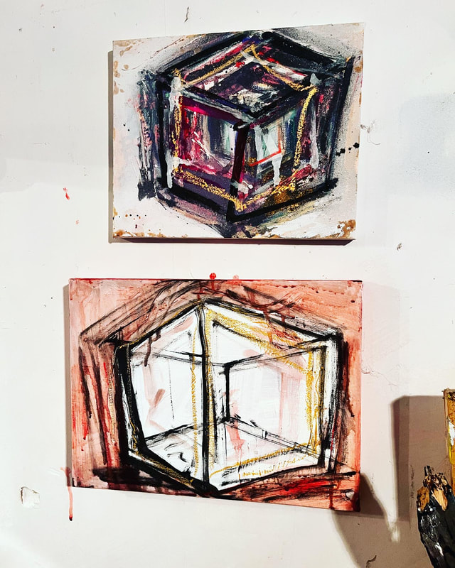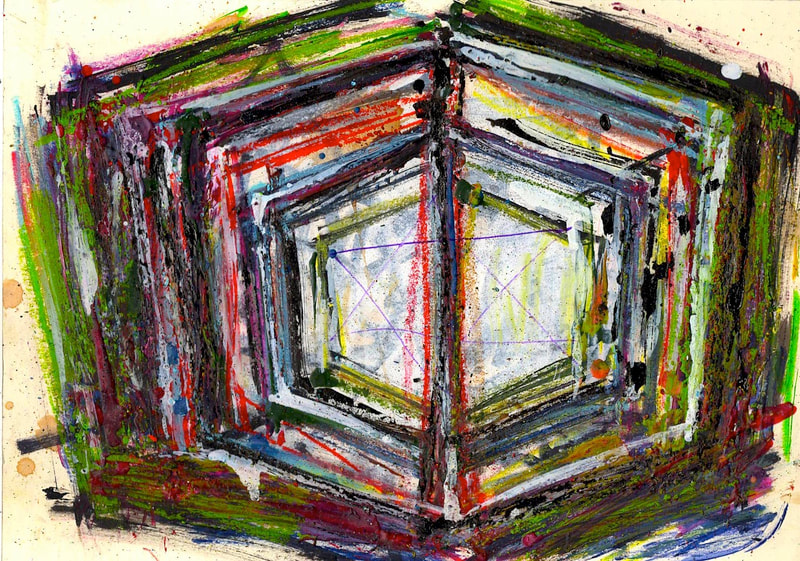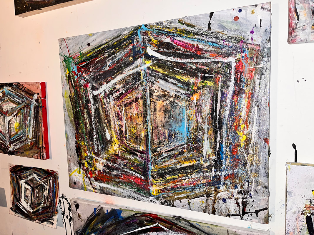 My art is a mystical practice in sacred geometry, wielding color and line to conjure the sensation of dynamic Platonic forms, made with oil, acrylic, oil stick, ink, crayon and liquid paper on canvas, and museum board over the past year. The optical illusions created in these pieces are born from a flat, two-dimensional surface, and can only exist within the viewer's mind. I employ Expressionism to breathe life into these four-dimensional creations, weaving whimsical arabesques that dance between figuration and abstraction.