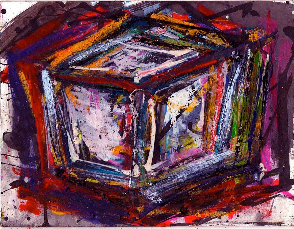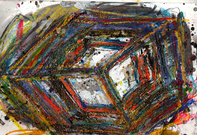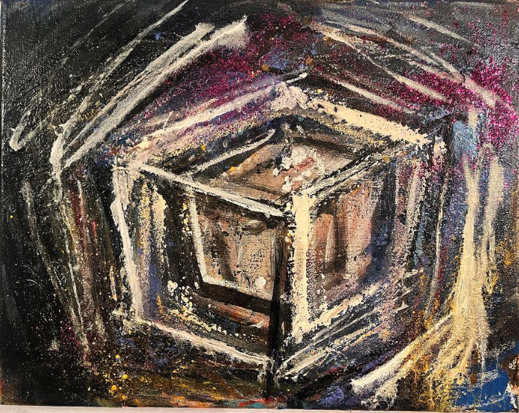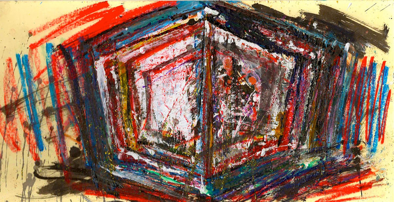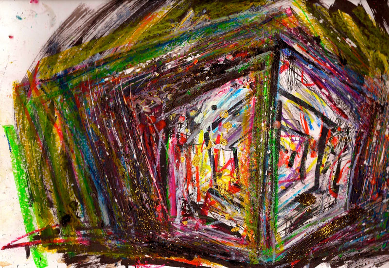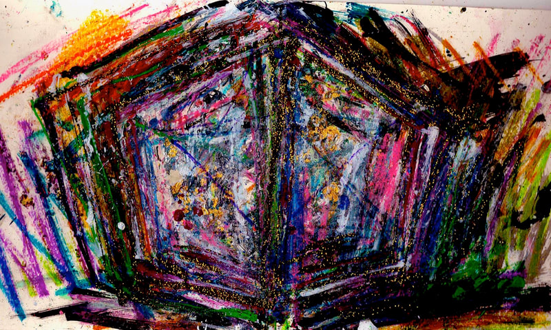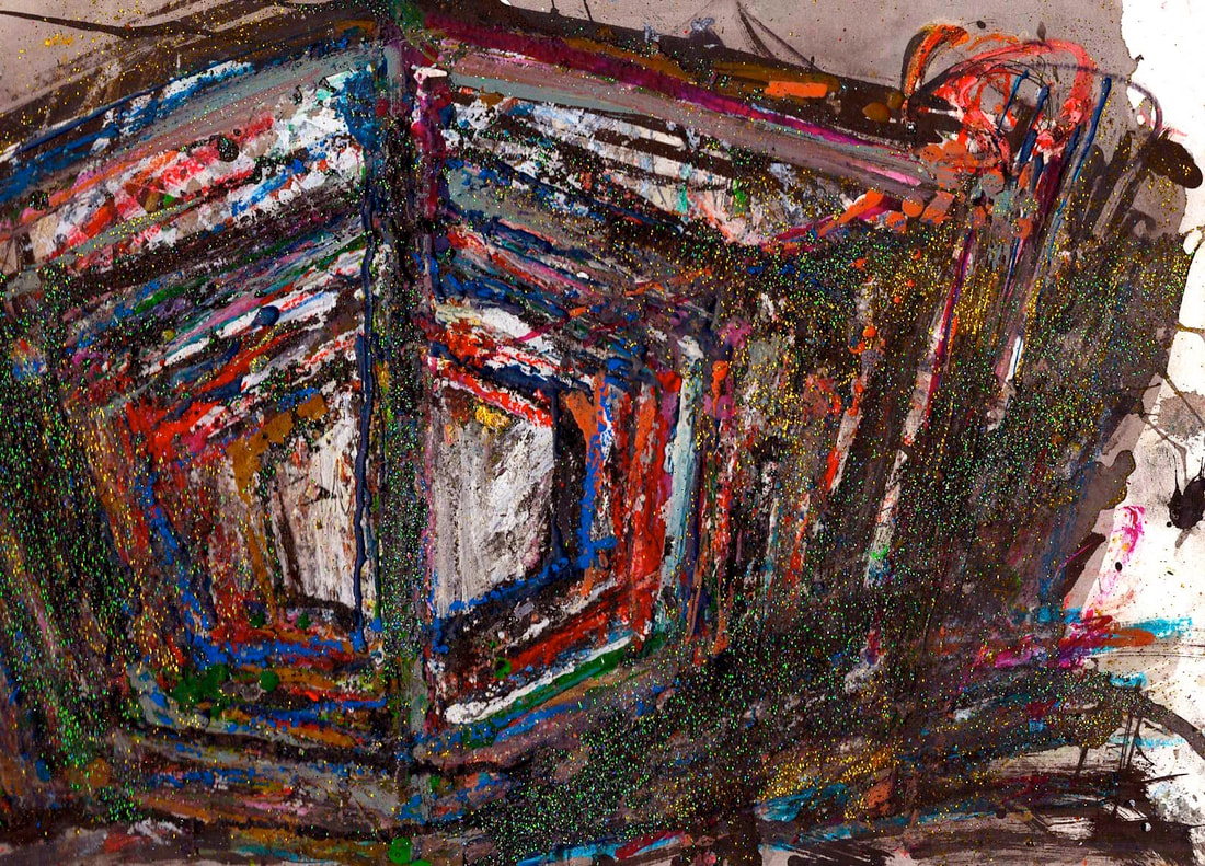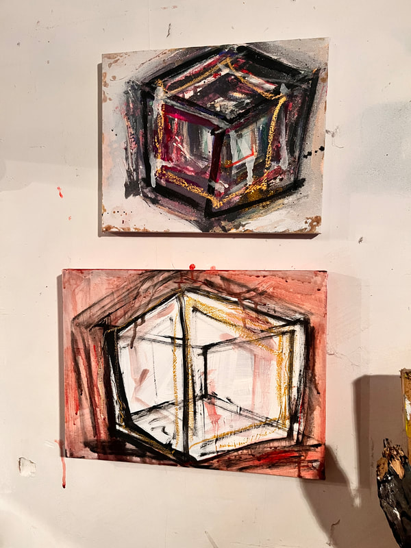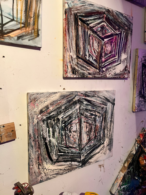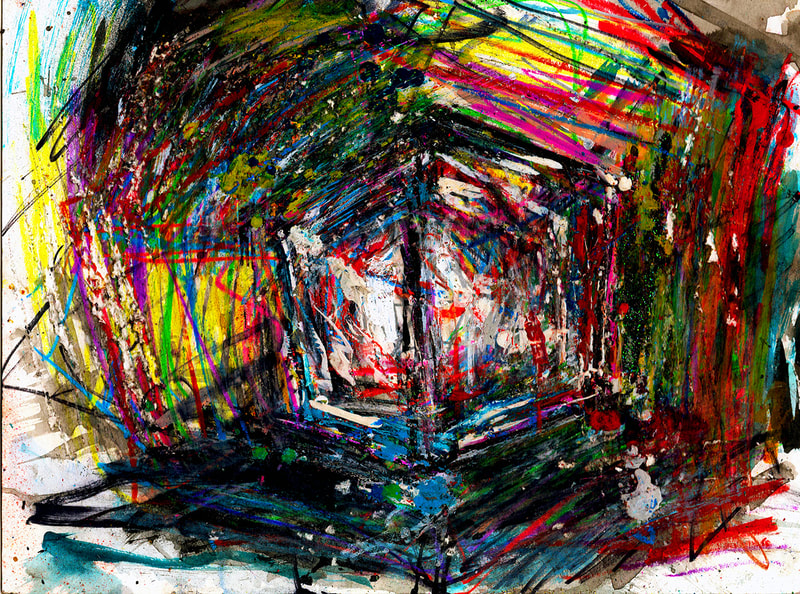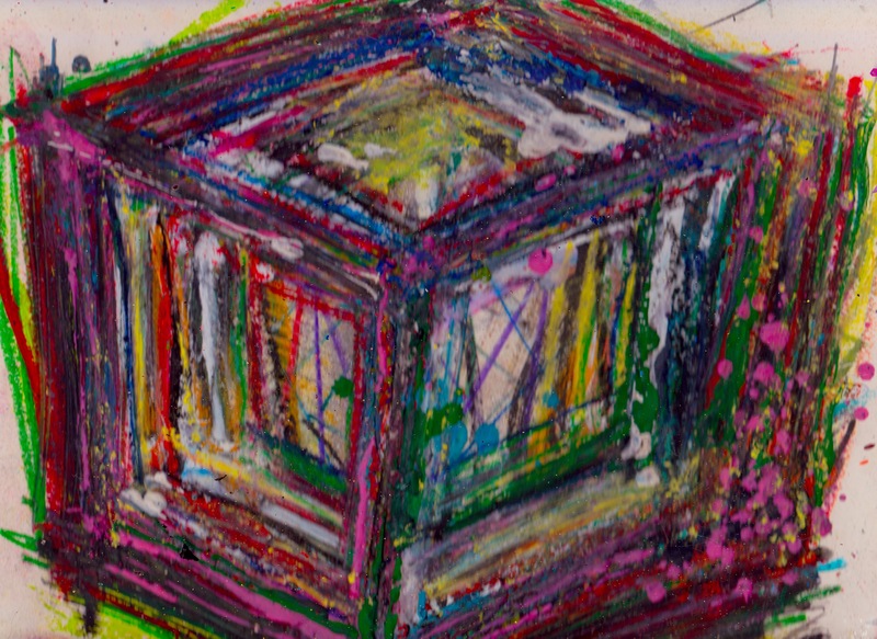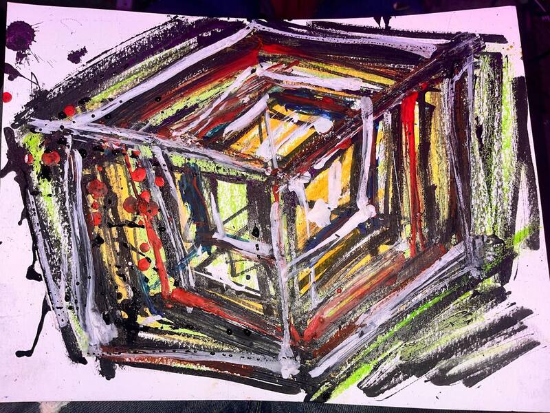 My art is a mystical practice in sacred geometry, wielding color and line to conjure the sensation of dynamic Platonic forms, made with oil, acrylic, oil stick, ink, crayon and liquid paper on canvas, and museum board over the past year. The optical illusions created in these pieces are born from a flat, two-dimensional surface, and can only exist within the viewer's mind. I employ Expressionism to breathe life into these four-dimensional creations, weaving whimsical arabesques that dance between figuration and abstraction.