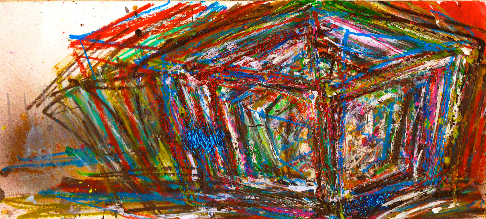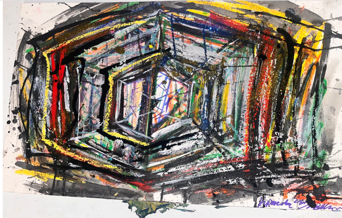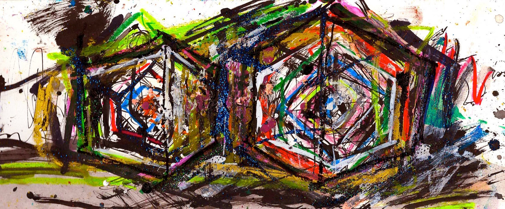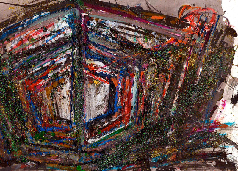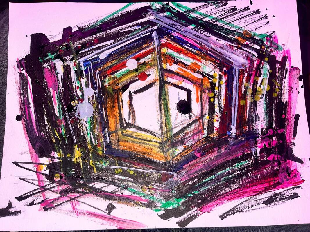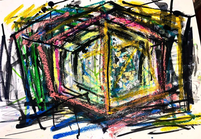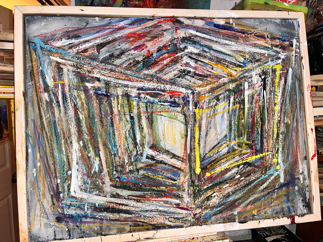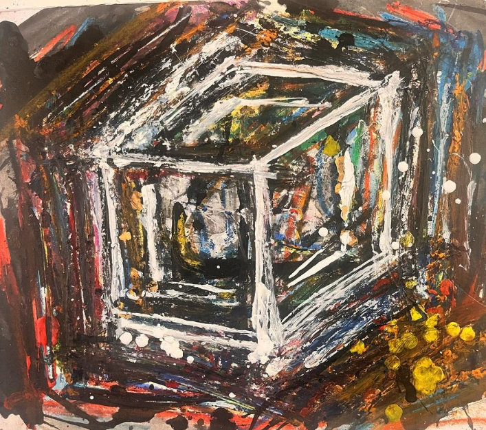 My art is a mystical practice in sacred geometry, wielding color and line to conjure the sensation of dynamic Platonic forms, made with oil, acrylic, oil stick, ink, crayon and liquid paper on canvas, and museum board over the past year. The optical illusions created in these pieces are born from a flat, two-dimensional surface, and can only exist within the viewer's mind. I employ Expressionism to breathe life into these four-dimensional creations, weaving whimsical arabesques that dance between figuration and abstraction.
