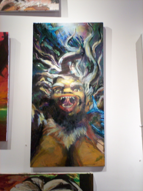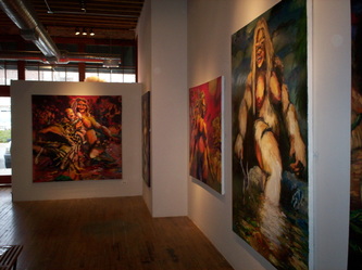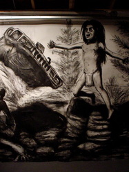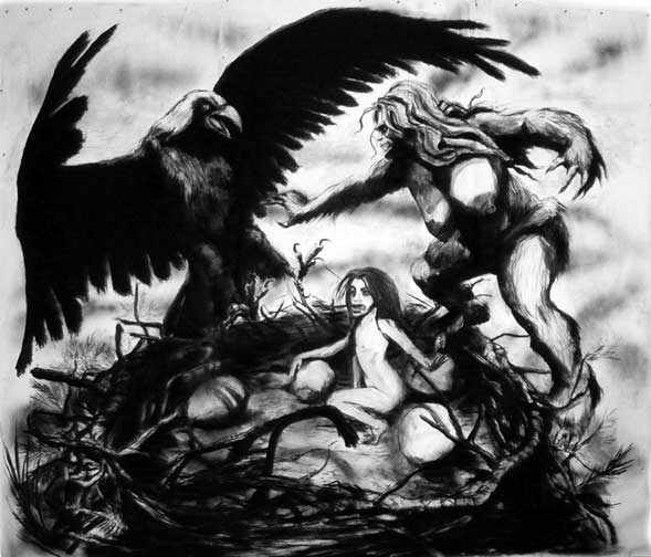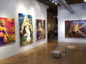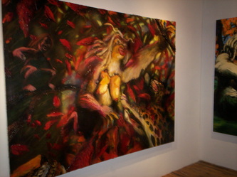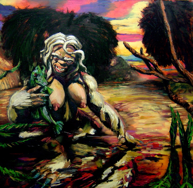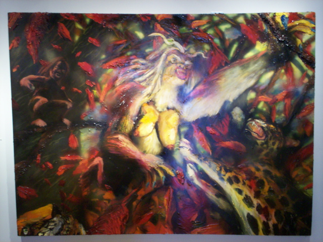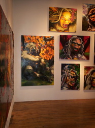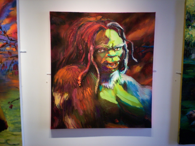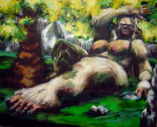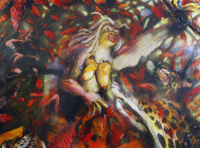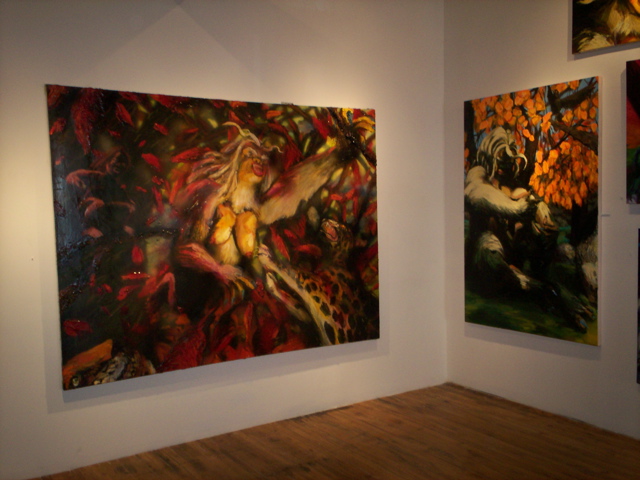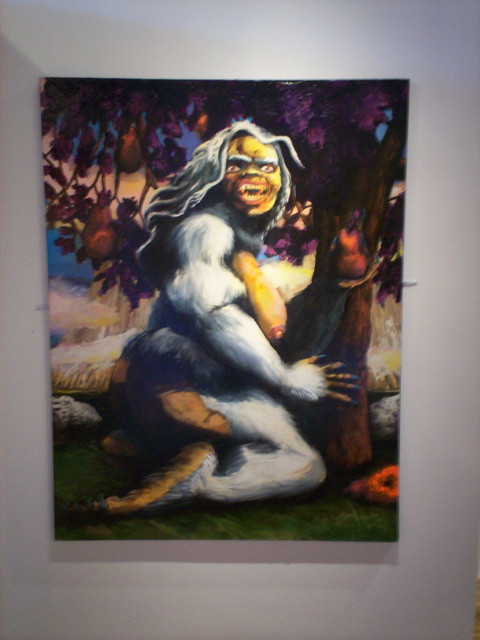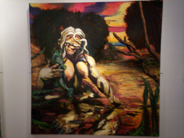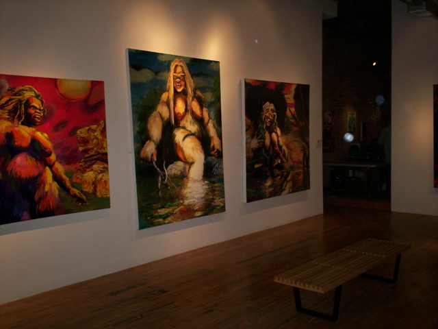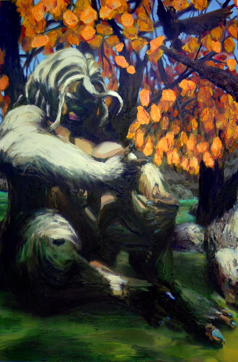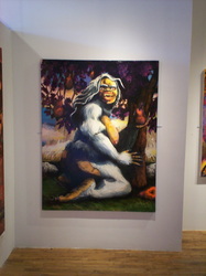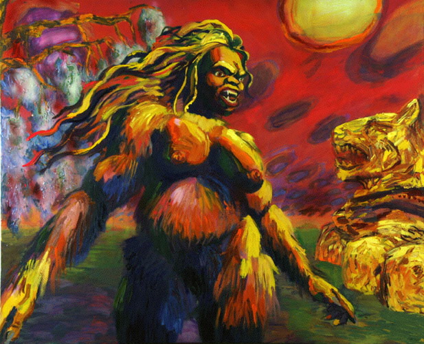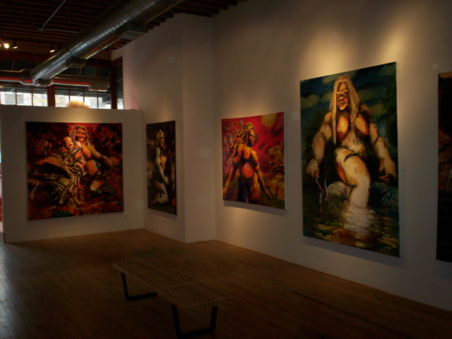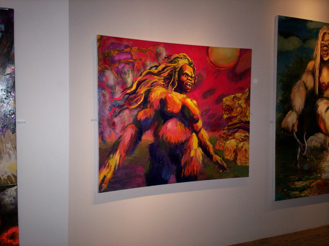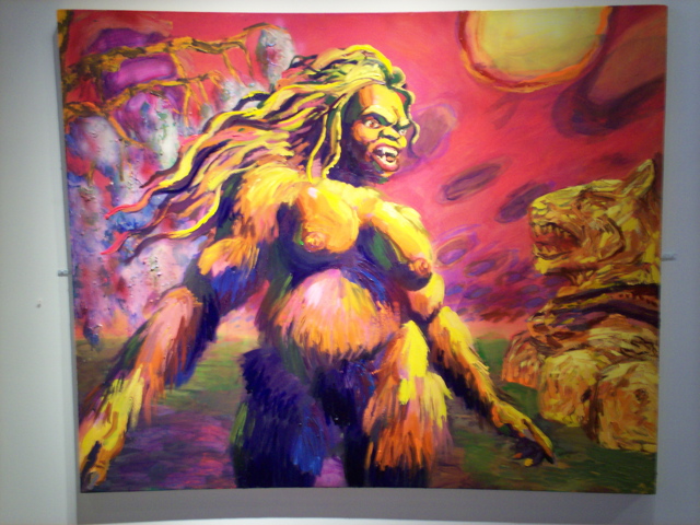 Bell's 'Kala' series draws us in by aping pulp and comic book styles, tapping their raw, charismatic, kinetic zing. Here is Kala fighting a giant eagle to swipe an egg for the feral girl she's taken into her protection. Here the behemoth battles a troop of 'sportsmen,' tricked out in the latest newfangled gear, sure to despoil the wilderness. Here she fucks an awestruck, bearded naturalist. Here she snatches a fish from a muddy primordial stream or forlornly plays a harp concocted from a tree and hair and spit or something. And right there is the ludicrous joke of my friend's project -- think 'Bambi' as a musical starring Arnold Schwarzenegger in drag and you're in the neighborhood -- but Bell is joking on the square. He asks why we as a society are still so uncomfortable with powerful, independent women? Why do we mass produce pop whore-heroines outfitted in action-lingerie that leaves just enough to the imagination to evade the censors? Why does the exotic so turn us on? Why is our love of nature so often expressed by driving over it, shooting it, fencing it off, drilling it, chopping it, paving it, polluting it? These are ultimately paintings about morality.