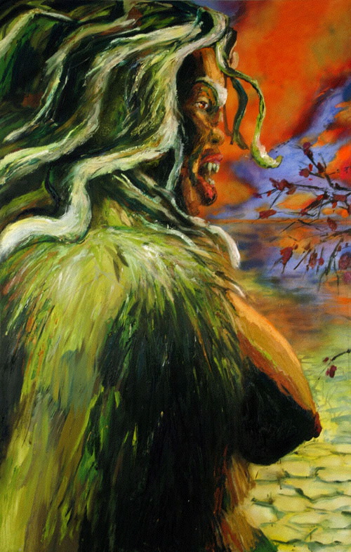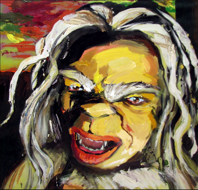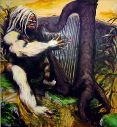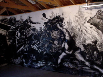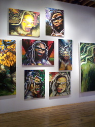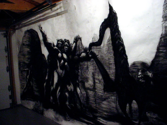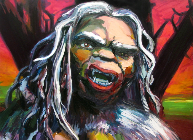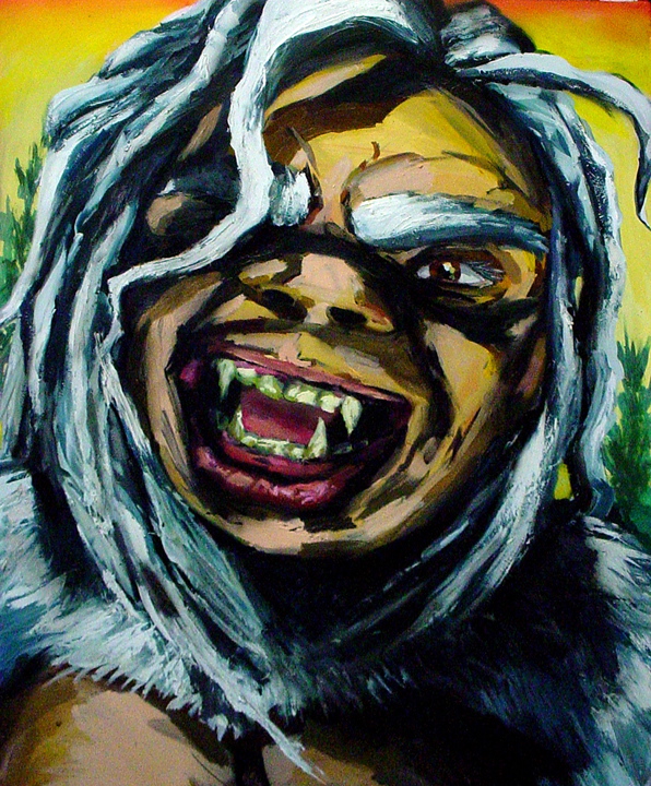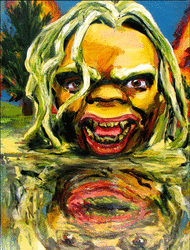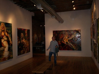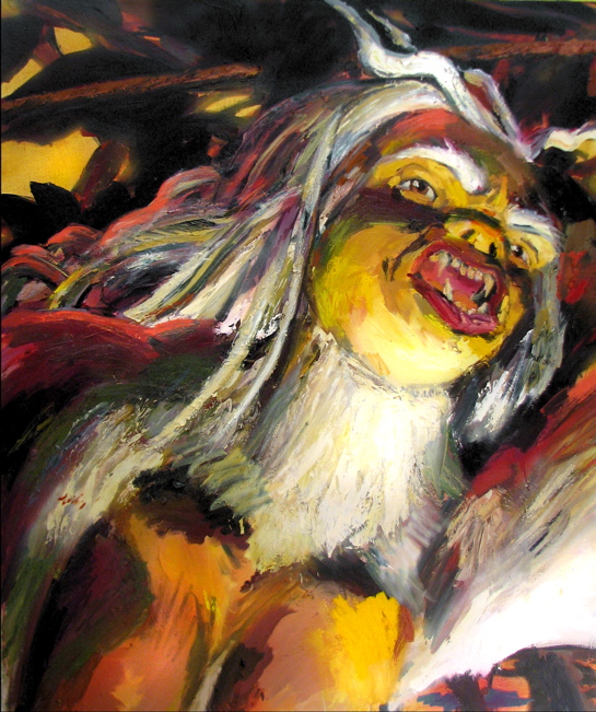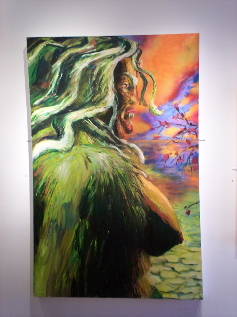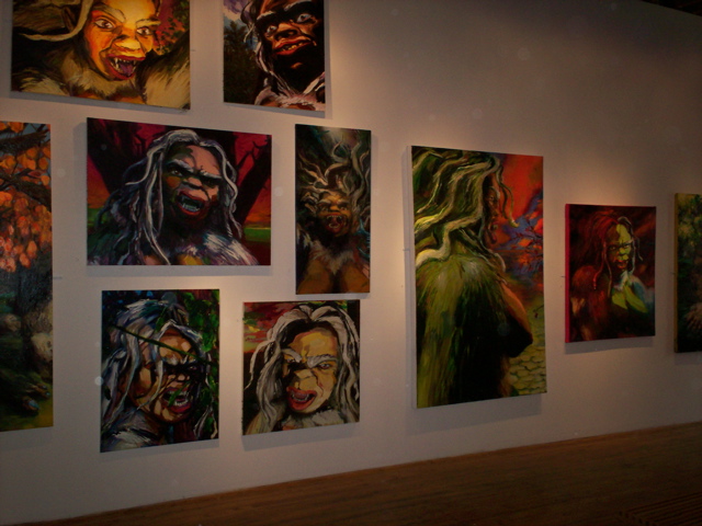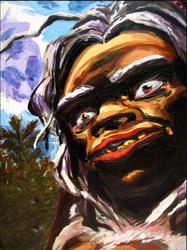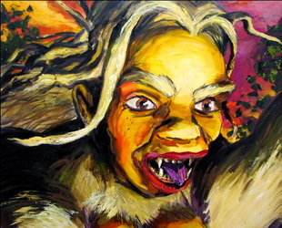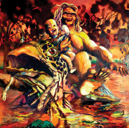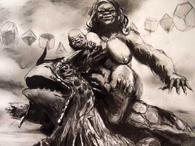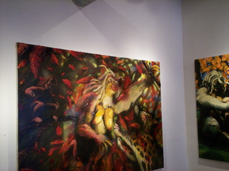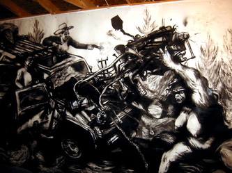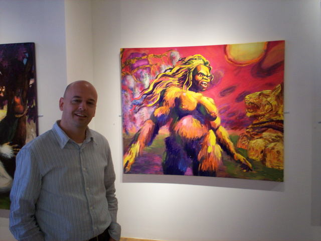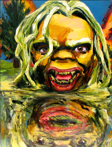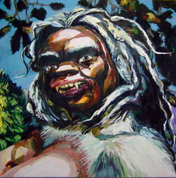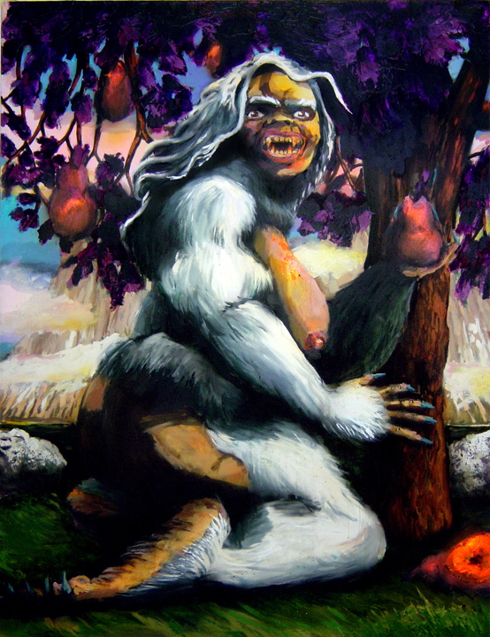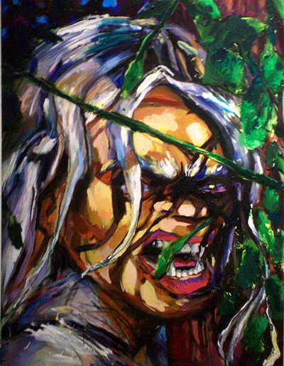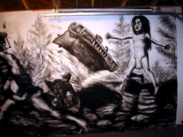 Bell's 'Kala' series draws us in by aping pulp and comic book styles, tapping their raw, charismatic, kinetic zing. Here is Kala fighting a giant eagle to swipe an egg for the feral girl she's taken into her protection. Here the behemoth battles a troop of 'sportsmen,' tricked out in the latest newfangled gear, sure to despoil the wilderness. Here she fucks an awestruck, bearded naturalist. Here she snatches a fish from a muddy primordial stream or forlornly plays a harp concocted from a tree and hair and spit or something. And right there is the ludicrous joke of my friend's project -- think 'Bambi' as a musical starring Arnold Schwarzenegger in drag and you're in the neighborhood -- but Bell is joking on the square. He asks why we as a society are still so uncomfortable with powerful, independent women? Why do we mass produce pop whore-heroines outfitted in action-lingerie that leaves just enough to the imagination to evade the censors? Why does the exotic so turn us on? Why is our love of nature so often expressed by driving over it, shooting it, fencing it off, drilling it, chopping it, paving it, polluting it? These are ultimately paintings about morality.