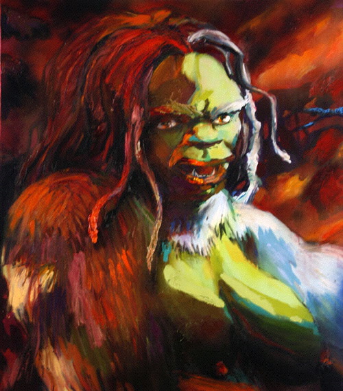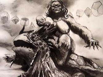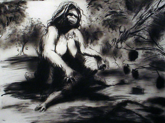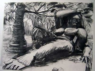 Bell's Kala is Beauty and the Beast rolled into one big, hairy woman-thing with a pig nose and bare breasts and behind. (R. Crumb eat your heart out.) As such, Bell takes the pretty refinement of classical nudes, really the whole Western cannon, (especially Gauguin's sultry, exotic 'savages') and shouts it's all just tits and ass. You squirm because you can't turn her messy seminudity into a classical ideal in safe white marble. Would she just throw a shirt on?