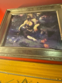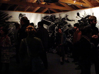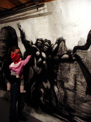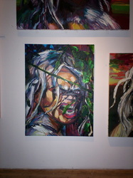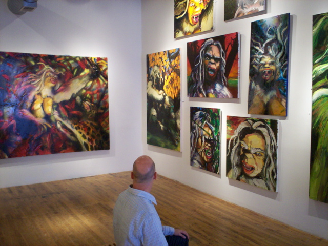 Bell's technique too teases us with a mix of straight-on skill and lunkhead wise cracks. These are serious paintings full of deft painterly passages a la the New York Action Painters or Bay Area Figuratives. And they are of the scale and ambition of such Abstract Expressionist works too -- which stole the idea from 19th century history painting. You have to be in their presence to really get them. In reproduction they shrivel up into clumsy illustrations. But in the same room, like Kala, they wallop you over the head with their brute physicality.