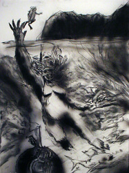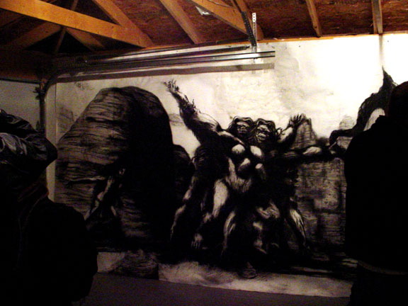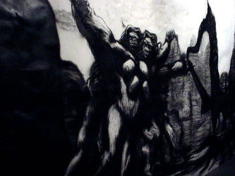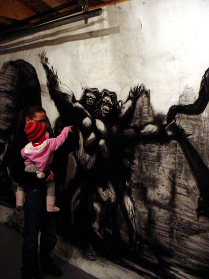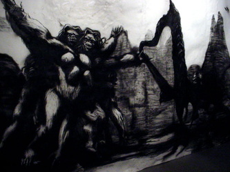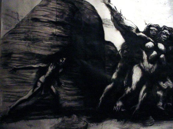 Bell's artwork has often been about the odysseys of lumbering titans and ancient gods, (male) creatures built as big and as brawny and as ambitious as he is. Here, telling the tale of a beastly woman, Bell speaks of an awkward and ultimately isolating strength and bulk and intelligence and of the resulting melancholy struggle to find one's place in the world. He speaks about vulnerability. And in doing so, he plumbs something more deeply human.