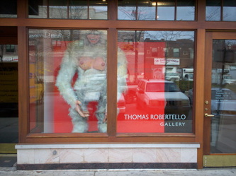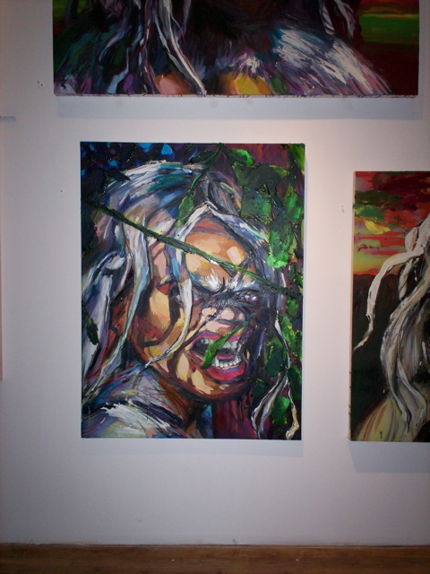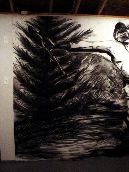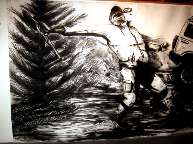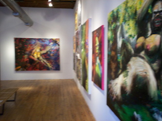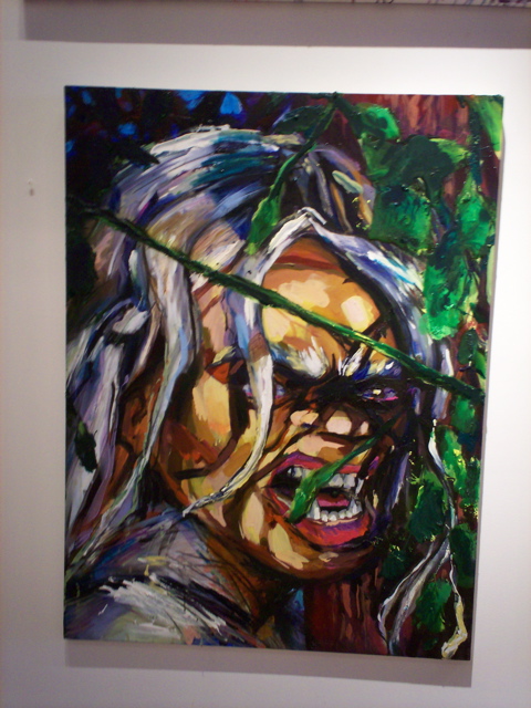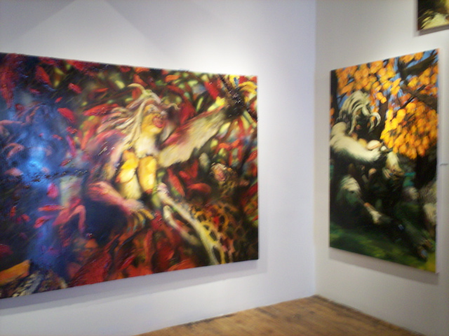 Then you're stopped short by the purposely ham-handed gags: A diptych shows Kala clocking a coffee-toting, G.I. Joe deer hunter from two different angles. The stream in one painting and Kala's tears in another are executed in clear epoxy, making the paintings' construction all too literal, a visual pun. But whatever Bell gets up to formally, his narrative keeps asserting itself -- Kala refuses to quiet down for such erudite considerations as the way the slathered on acid green resolves into leaves. Just like in a fairy tale we side with the tenderhearted Beast, feel sorry for her, root for her to defeat the superficial jerks of Progress, but in the end we still sorta wish she (and the paintings too) would make it easy for us and turn into a beautiful, cleaned-up young princess -- not stay a Shrek. Bell dares us to love this uncouth, unflinching imperfection.