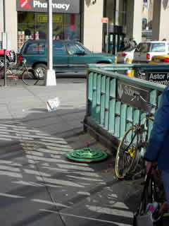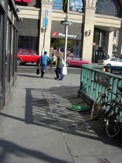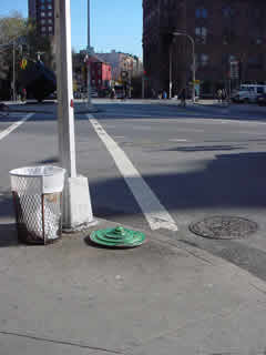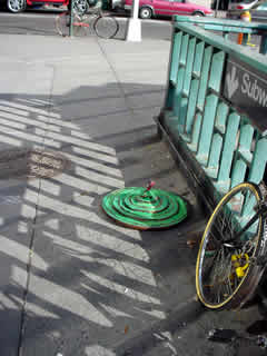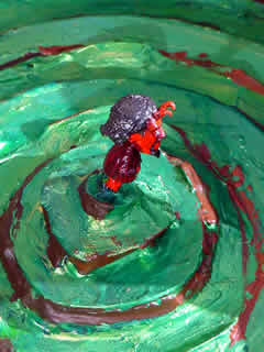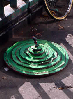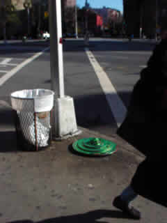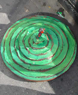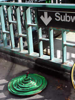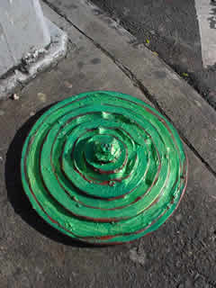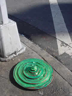 Trashsure #13- Green Tangent- 32" in diameter- wood, acrylic, joint compound, and plastic on metal chair feet. With nine circles a imp rules over and is trapped within his own Jasper Johns-ian grassy fecund Hell. On returning two hours later, I found the Green Tangent had been moved to a sunnier exposure and the imp had been liberated. Abandoned Nov. 23rd, 2002- Lafayette and Astor Place., NY, NY -Jason Robert Bell