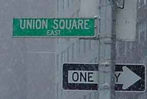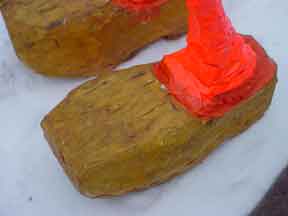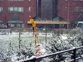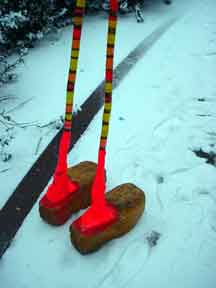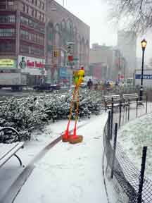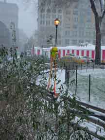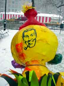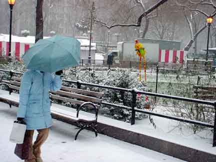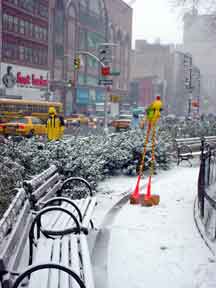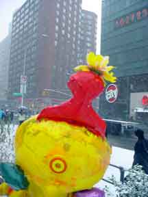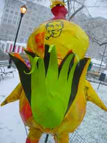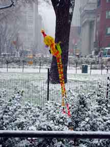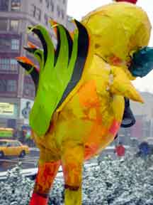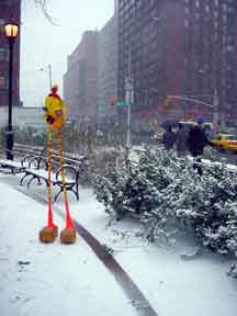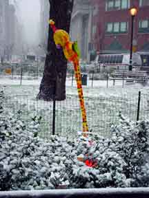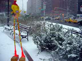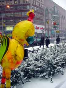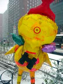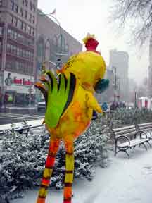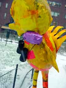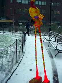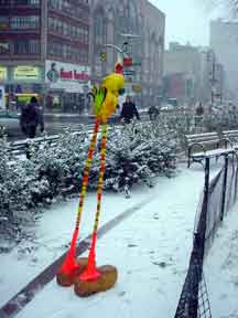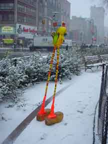 Trashsure #14- The Orphan's brother. - 6.5'x1' x 9", plastic, paper, acrylic, wood,and epoxy,This first snowfall sets the stage for the Orphan's brother- a patchwork, peacock, stork, Chilly Willy. Will his search for his brother be in vain? With the image of J.R. "Bob" Dobbs on the back of his head this bird is rady to get dirty-wearing handcrafted wooden shoes for sabotage with binoculars ready.How will this cold earth find him? Hopefully his bright orange "socks" will keep him warm- Abandoned Dec. 5th, 2002 South East Union Square, NY, NY