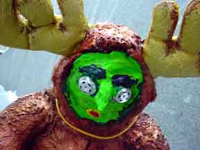 his green fucund face is now a comic mask, his burden to bear atop