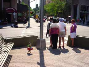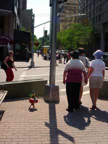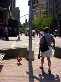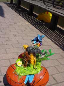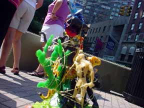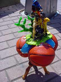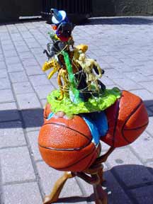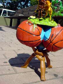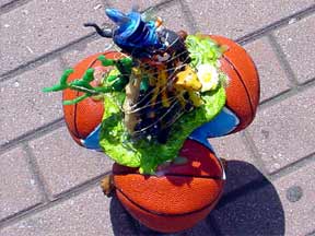 Trashsure #23 - Mount Polyorchid . - 1.5'x1'x1', found objects, acrylic, plastic, rubber, gold wire, epoxy, and three almonds- All the pieces from a African safari play set are piled into a type of food chain, a top three mini-basketballs, a top a tripod of interlocking "tribal" figures, all held together with gold wire and liberal amounts of hot glue and epoxy. Each basketball has an almond on it too (don't ask). As I was shooting this my camera ran out of battery juice, which was appropriate seeing as how a few hours later the whole city's power cut off too.- Abandoned Aug. 14th, 2003 Broadway and 63 st., NY, NY
