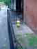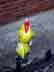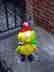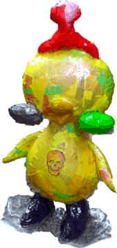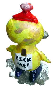Trashsure #1 -The Orphan- 2' x 1' x 9", plastic, paper, acrylic, and epoxy, - A transformed Chilly Willie inflatable, the Orphan is a enigmatic being, a flaming skull on its belly and a "Kick Me" sign on its back, standing in a puddle of its own epoxy covering- is it a hapless misfit or something sinister and unnamable. Abandoned May 6th, 2002 corner of 10 Ave. and 21st., NY, NY -
